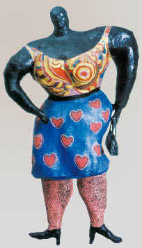 是名噪一时的“射击绘画”令妮基跻身“新现实主义”艺术圈,但为公众熟知的,则是她从1963年开始制作的“娜娜”(Nanas):一位色彩斑斓、体型丰满的女性——既是古老的图腾偶像,大地之母,也是古代世界中的女神;既是电影中出现的明星、女巫,也是公众熟悉担当各种角色的当代女性。娜娜由此成为妮基的符号。借由娜娜,妮基以女性的视界,反抗庸俗的女性影像和低俗的性审美观,谴责社会对妇女的角色定义——生育孩子的工具、贪婪的母亲、巫婆与妓女……