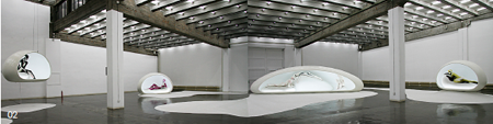 UNMASK的新作让我们的期待变得更加踏实了,这批新作品无论从艺术语言、观念还是制作工艺与技巧和视觉冲击上来说,都是UNMASK的一个突破,也是新观念雕塑的一个突破。这几件体积大却视觉上显得空灵的雕塑作品,仍然延续了UNMASK一直以来的对自我的诗意化描述和想象的母题。与上一批作品“半透明”不同的是,这一批作品非常“实在”,“实在”得纤毛毕现。UNMASK创造了一些类人的生物,它们有着人的基因和面貌,却异化成身上长出华丽而优雅的、白色、黄色、紫红色、黑色以及相间的美丽毛发,就像动物世界中美丽的动物皮毛斑纹一样。但从毛发的底层透出的粉红色肉色我们又能清楚地看到人的皮肤和气息。这些皮毛象征了在这个科技发达、经济发达的时代人的异化和自我保护,就像动物 的皮毛和色彩是动物用来在野外保暖以及保护、隐藏自己的保护色一样。巧合的是,今天国际上遇到了经济寒冬与这组作品中人物长上了厚厚的皮毛,正好相互映证了当今的人类是多么需要肉体和精 神的自我保护。在一个人们不知所措的年代,艺术家用自己的艺术想 象找到了一种心灵自我保护的形象。这既是一种艺术的想象,又是一种对现实的批判。让我们欣赏这些艺术品来得到心灵的抚慰吧。UNMASK创造那些似人非人的形象都有着美丽而安全的皮毛,却形单影只,忧郁而伤感,他们坐在纯白色的巨大光滑鹅卵石上,在白色的空洞之穴中,独自相处。就像这个时代的忧郁和孤独,让人很容 易想到自己在这个大时代的无助和迷茫。其中有一件作品是三个长着不同斑纹的白色皮毛的人以各种不同的姿态同处一个光滑白色洞穴之中,他们或蹲,或趴在白色巨大卵石上,就像某种动物在享受午后的阳光,在小憩。但与动物的神态不同的是,这三个人物都有着一种思考的表情、深沉的表情、智慧的表情。作品中隐喻着某种社会关系和人的生存状态。艺术家创造出非现实的自我,让人类无法解脱的困境和没有答案的思索在艺术的语境和想象中自我轮回和排解。这也是一种理想主义和对自我的深度放逐。